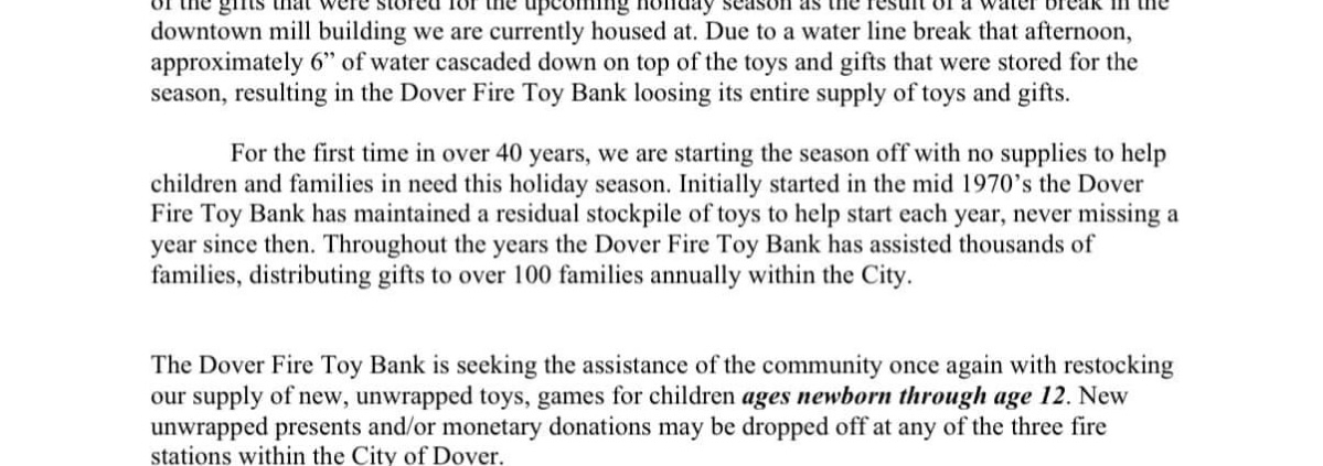 Join us for a charity toy drive workout on Saturday September 21st! The Dover Fire Department lost their toys for the upcoming holiday charity season due to a flood. We want to help out! Some of our favorite members work for Dover Fire Department and help our community every day.